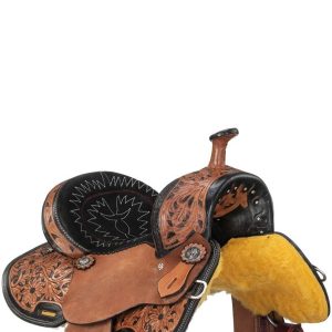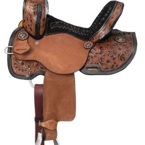 The Royal King Hawley Barrel Saddle is designed for the rider seeking both performance and style. This saddle showcases antiqued two-tone hand-carved floral tooling that adds a touch of elegance to its robust design. The deep seat, featuring fancy stitching, ensures comfort and security, making it ideal for high-speed maneuvers and tight turns.