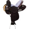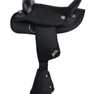 This Abetta YOUTH saddle is just as comfortable and durable as our full sized models. The youth saddle features a Pony All-Around Poly-Solid tree, scratch resistant and waterproof outer. It also features a 1000 denier nylon laminated to a closed cell foam on the jockeys, skirts and fenders. The saddle has a 7/8 Nylon rigging with Stainless Steel dee’s, 2″ Nylon Tapaderos stirrups, 2 1/2″ horn, 3″ Hi-back cantle and engraved silver concho trim.