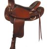 This Royal King saddle will trump any trail with its bold style and comfortable ride. The rawhide tree provides durability and comfort by absorbing shock. Additional comfort is produced by the padded high cantle and in-skirt rigging, which reduces bulk. The crupper ring will insure limited sliding as well as the endurance stirrup, which keeps your foot comfortable for hours and never causes chaffing.