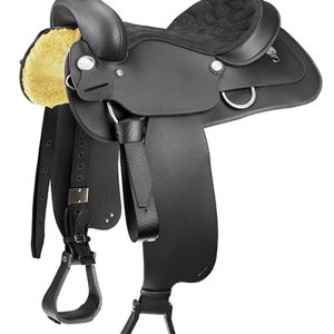 Double padded seat. Cantle height 4″ with Trail stirrups. Two sets of strings on clip dees with brass rigging.